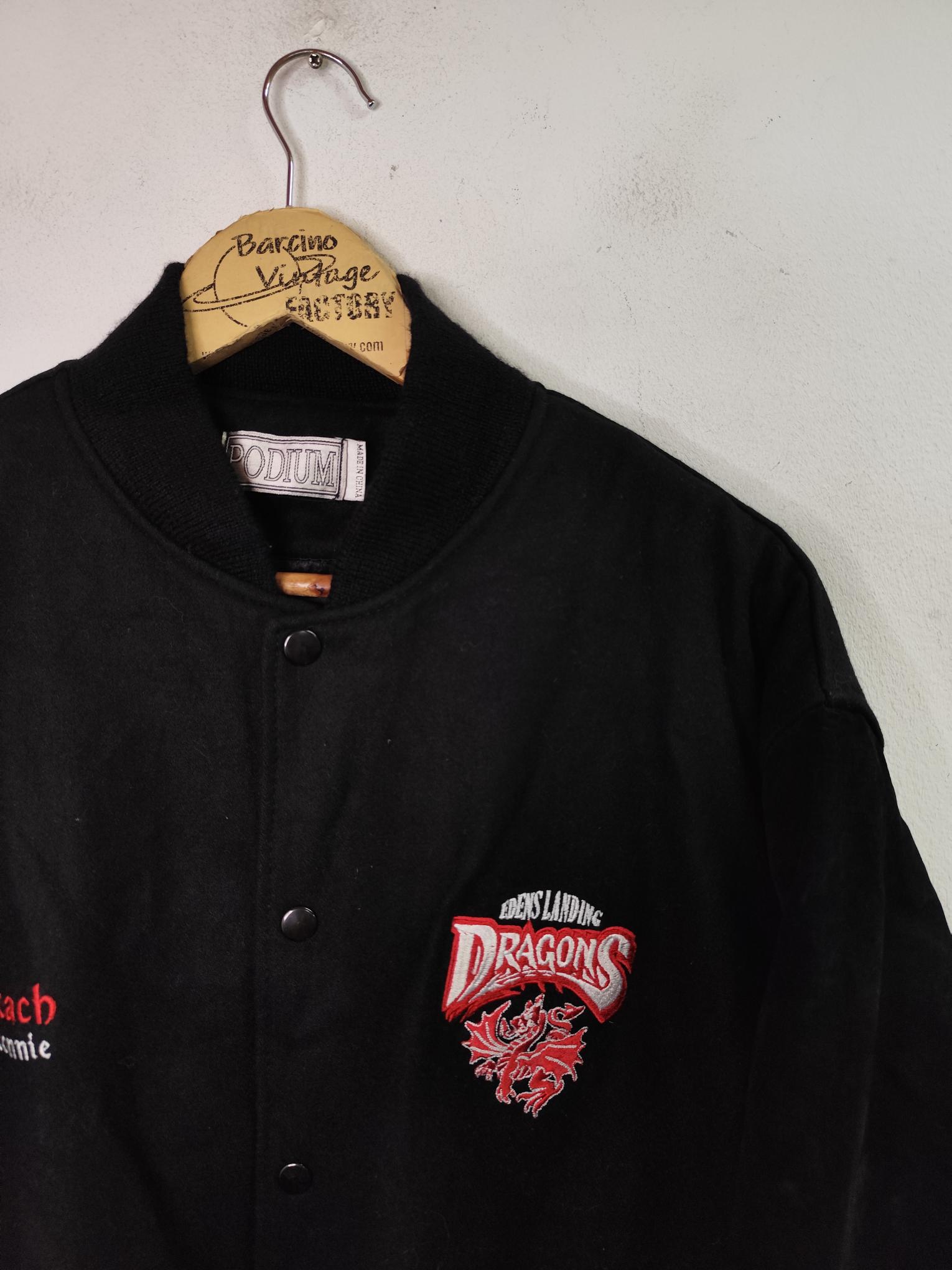 Chaqueta de ante y lana vintage Y2K 00s tipo university bomber en color negro y rojo, con botones y bordado delantero y trasero de un dragón chino. Ideal para los días más fríos de invierno para usarla con una sudadera o más capas debajo del abrigo. Queda genial tanto con pantalones vaqueros como con pantalones tipo chinos o de pinzas o incluso con una falda.