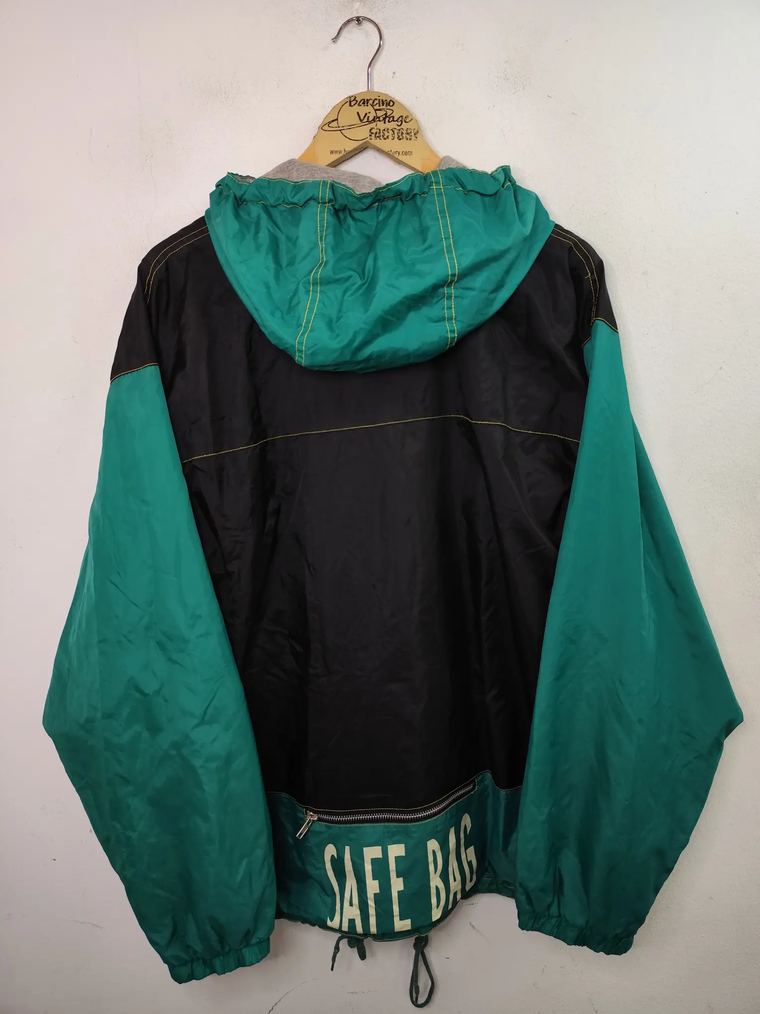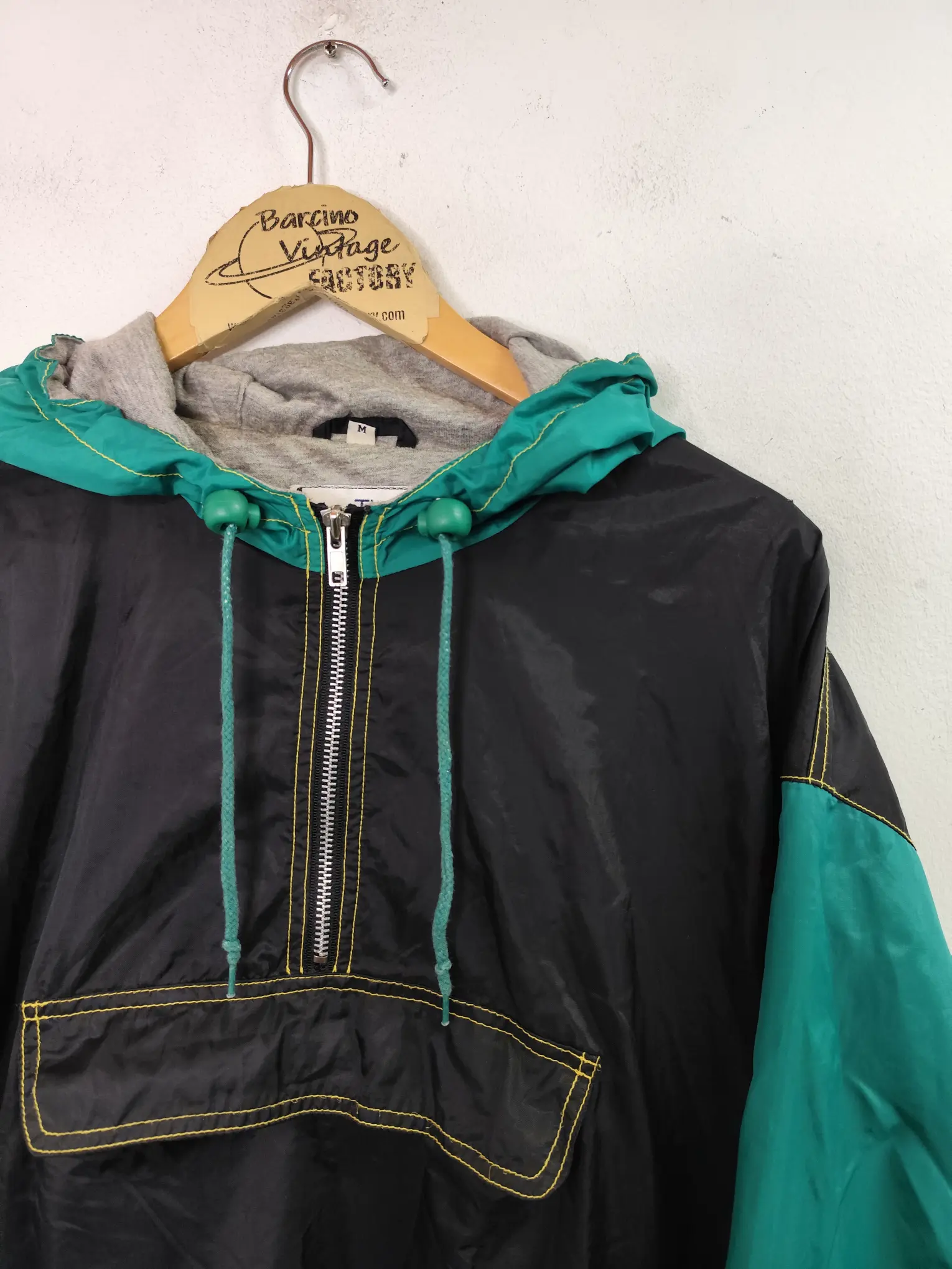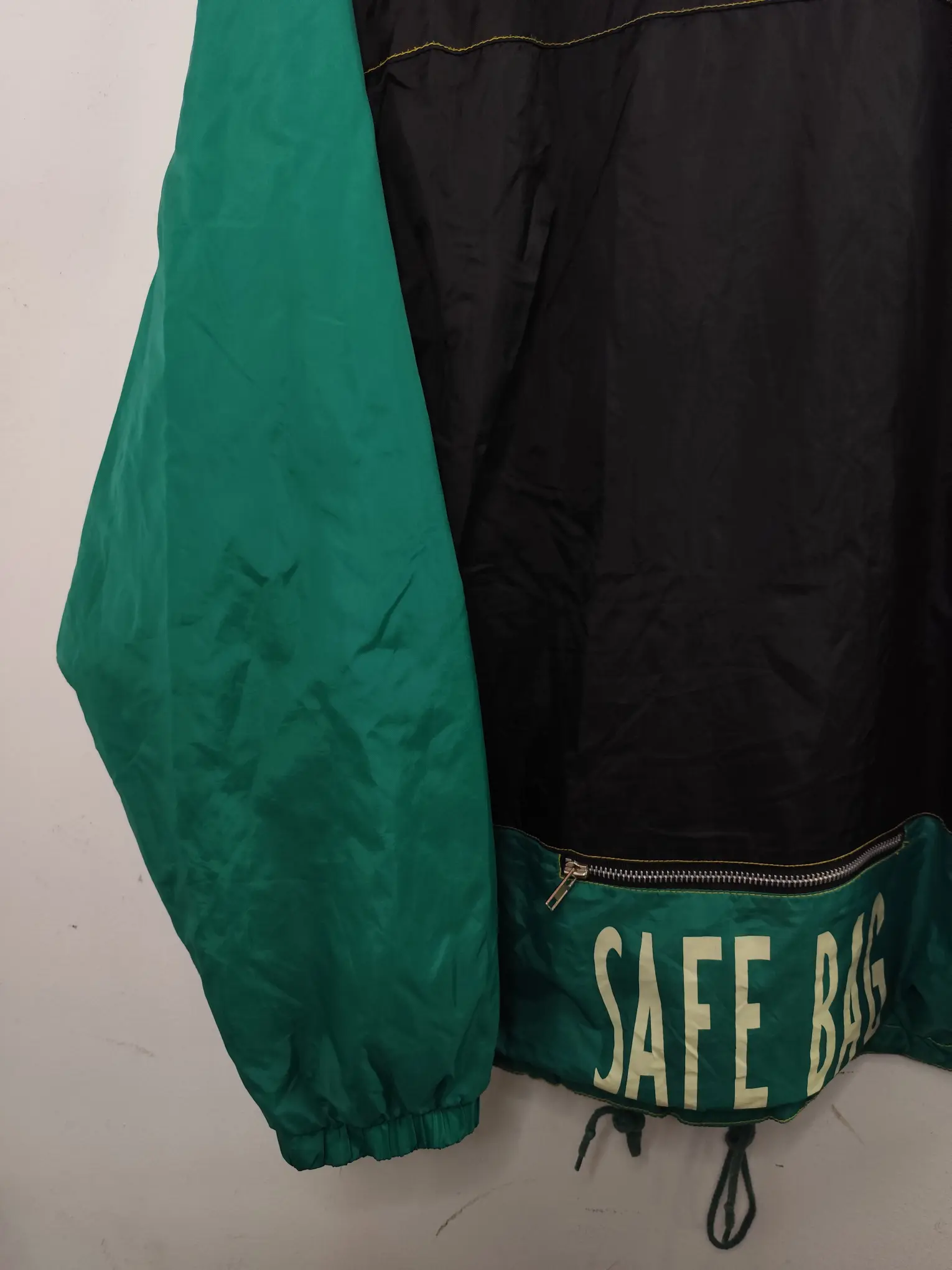 Chaqueta deportiva tipo sudadera cortavientos con media cremallera en el cuello, bolsillo delantero y trasero y capucha, en color negro y las mangas en verde oscuro. Ideal para primavera y verano en los días más fresquitos. Queda genial tanto con pantalones vaqueros como con pantalones deportivos o incluso con una falda si quieres darle un aire diferente a tu look.