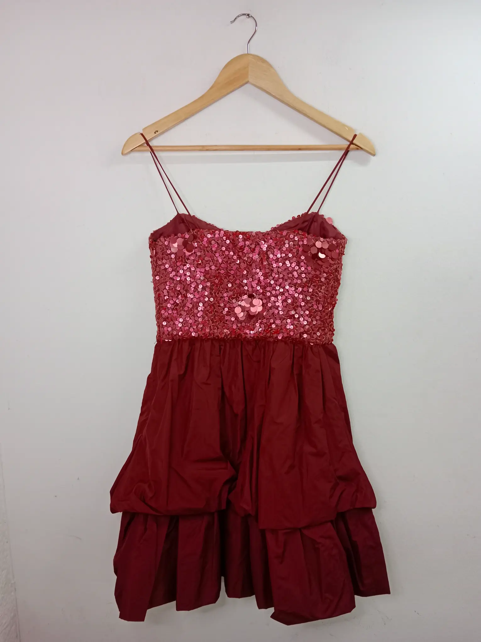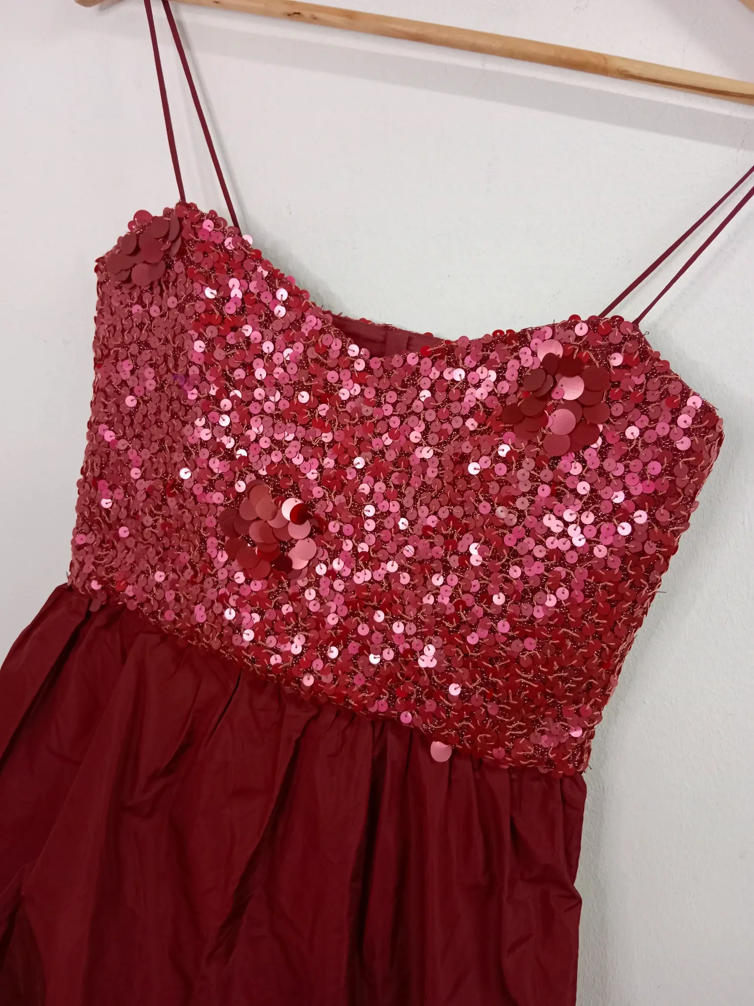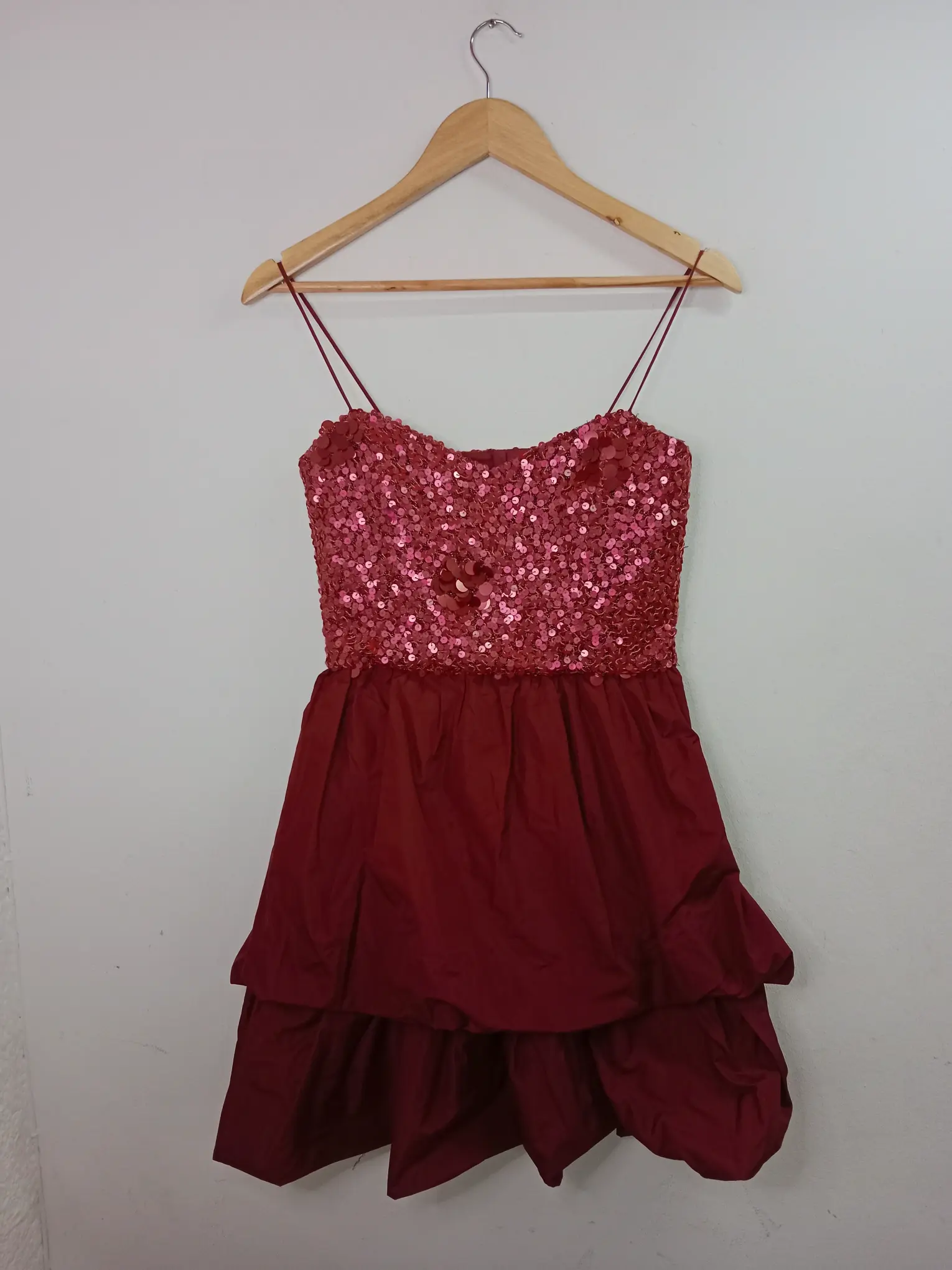 Vestido de invitada, celebración o cóctel de tirantes y corto en color rojo burdeos con la parte de arriba de lentejuelas y falda con vuelo y doble capa. Ideal para primavera y verano en los días más fresquitos o para invierno para llevarla con alguna americana o chaqueta tipo cazadora.