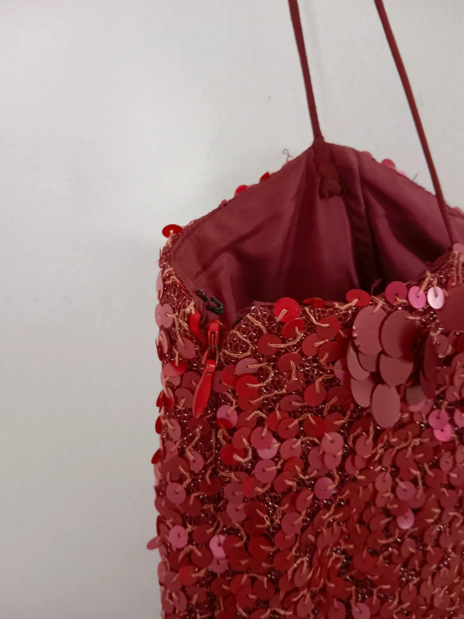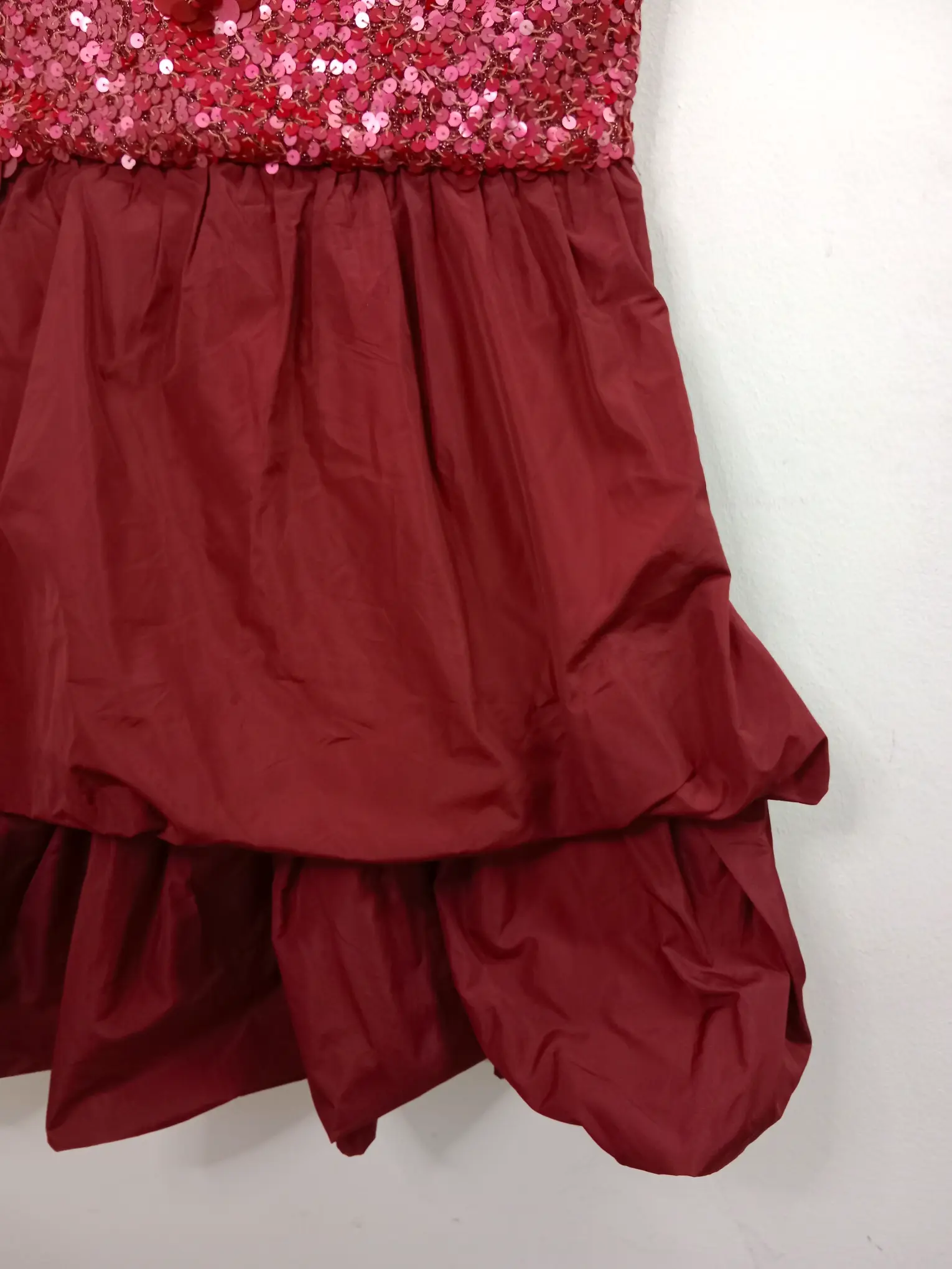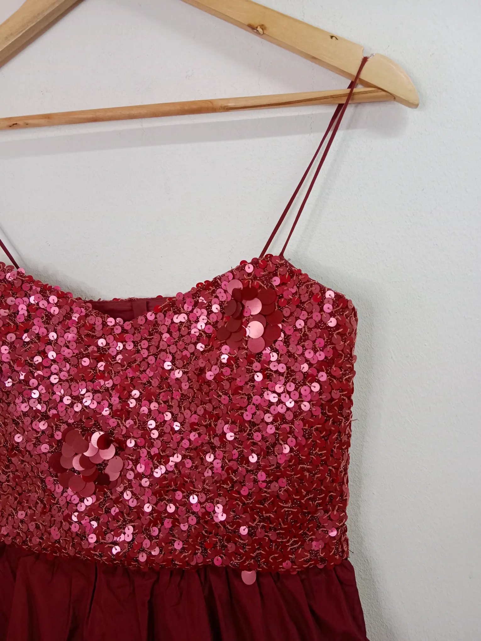 Vestido de invitada, celebración o cóctel de tirantes y corto en color rojo burdeos con la parte de arriba de lentejuelas y falda con vuelo y doble capa. Ideal para primavera y verano en los días más fresquitos o para invierno para llevarla con alguna americana o chaqueta tipo cazadora.